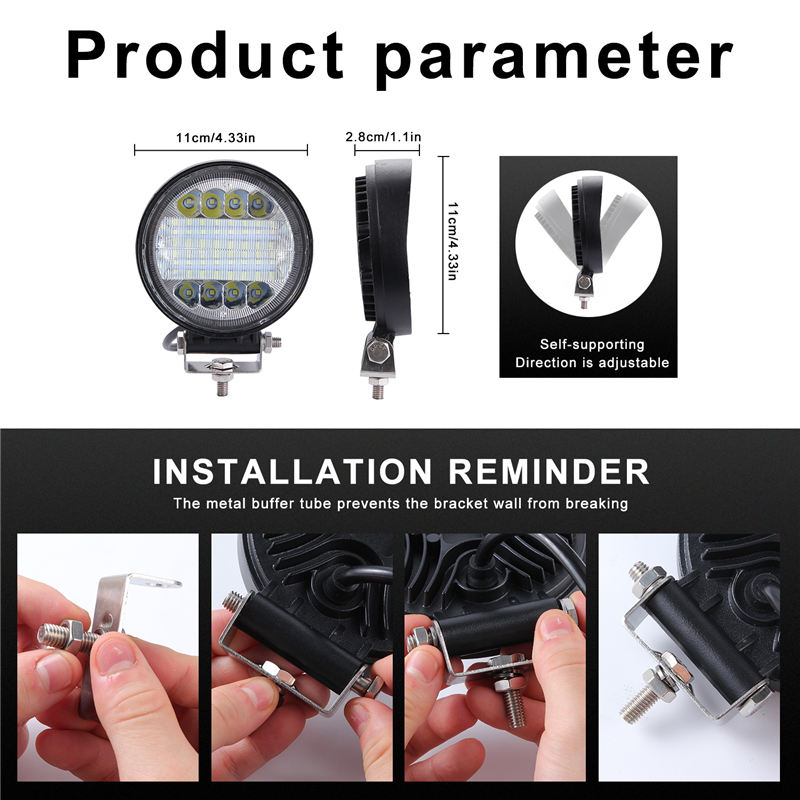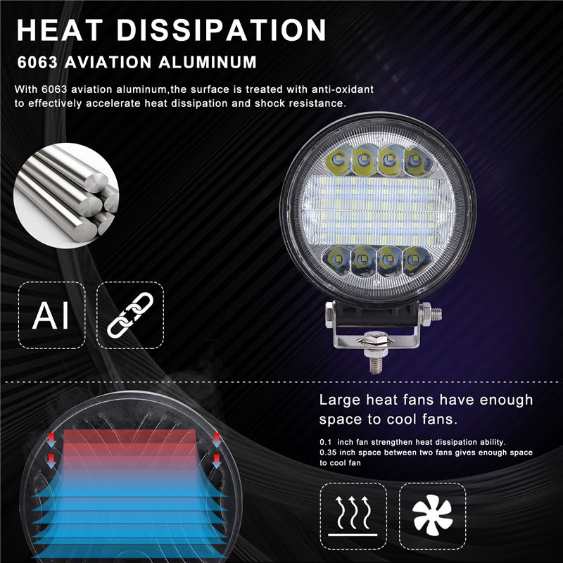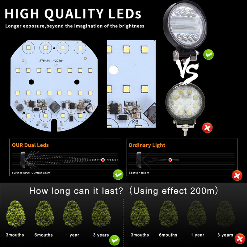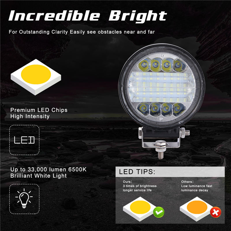 PERFECT VISUAL EFFECT - The Round led work light delivers performance through combination of the latest LED , matrix diamond shape reflectors plus high transmittance lens, which achieves 99% light utilization and 30° spot & 120° flood combo beam for perfectly visual experience.