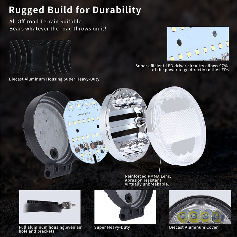 UNRIVALED VISIBILITY - The 4" Round led pods features dense 24pcs (per piece lights) high-intensity LEDs, deliver 72 watts and 10,080 lumens remarkable output of 6000k color temperature, maximize visibility while reduce visual fatigue and strain that can come from using higher color ranges.