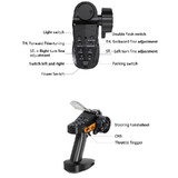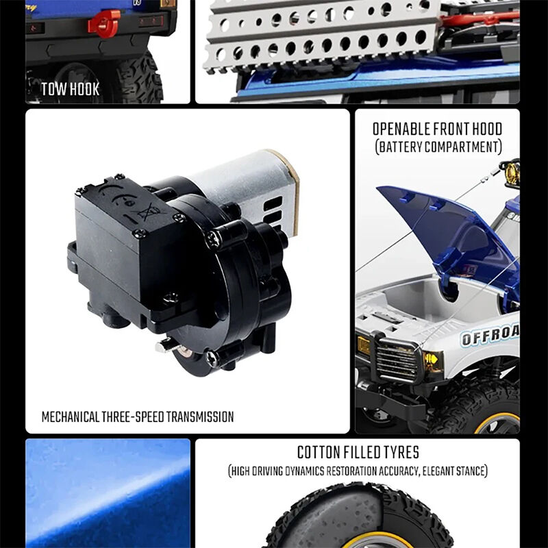 The model features a metallic painted body and a modifiable chassis, making it suitable for upgrades and custom builds. A high speed 9g motor provides strong torque output, delivering reliable climbing performance. The lighting system includes multiple modes such as fast flash slow flash constant light and headlight off, adding realism during operation.