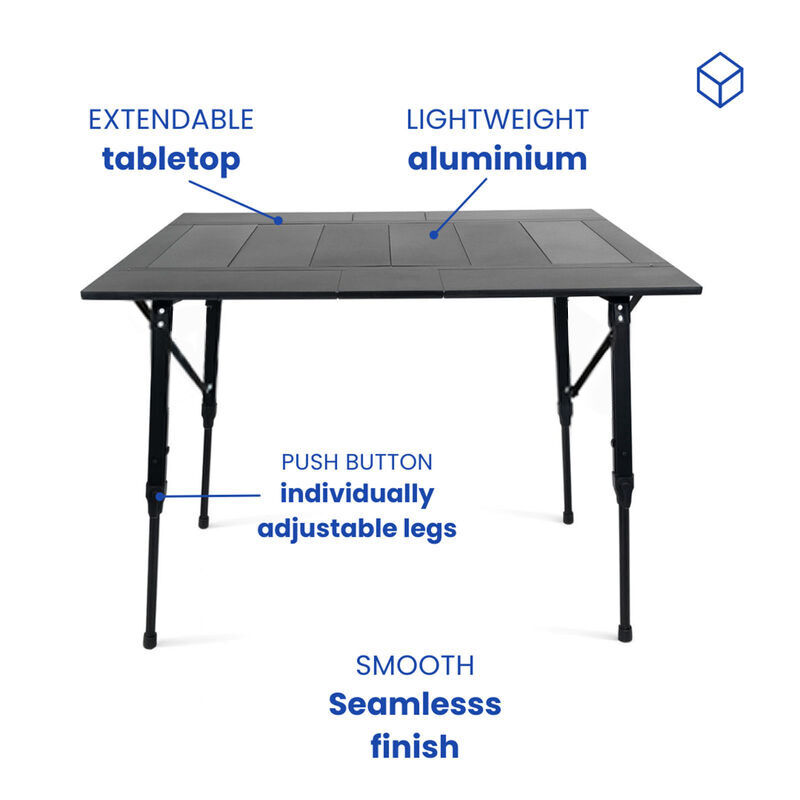 The table measures 86 × 42 cm without extensions and expands up to 86 × 66 cm using 6 clip-on extension panels, which can be attached on one or both sides to suit your needs. Despite its light weight, it offers impressive stability and strength, providing a reliable surface for meals, gear, or relaxation.