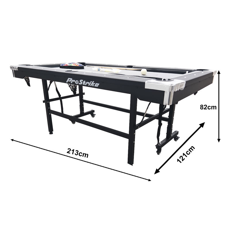 Bring the thrill of billiards into your home with the ProStrike 7FT Folding Pool Table, expertly designed for both fun and functionality. With a sleek modern look, solid construction, and practical fold-away design, it’s the perfect choice for game lovers who value both performance and space efficiency.One side features built-in wheels, making it simple to push away and store effortlessly.