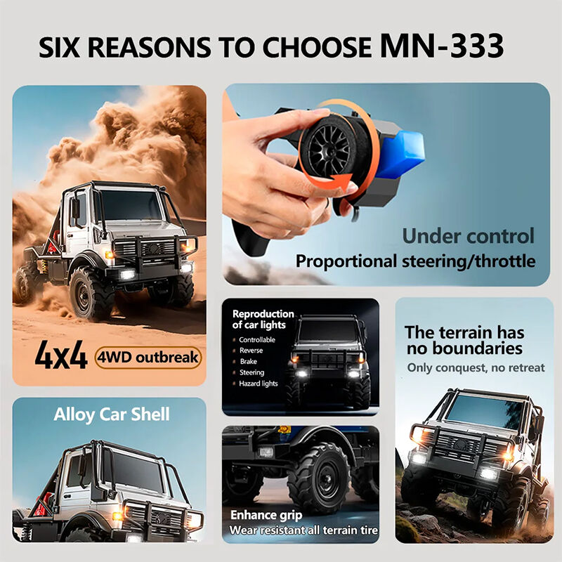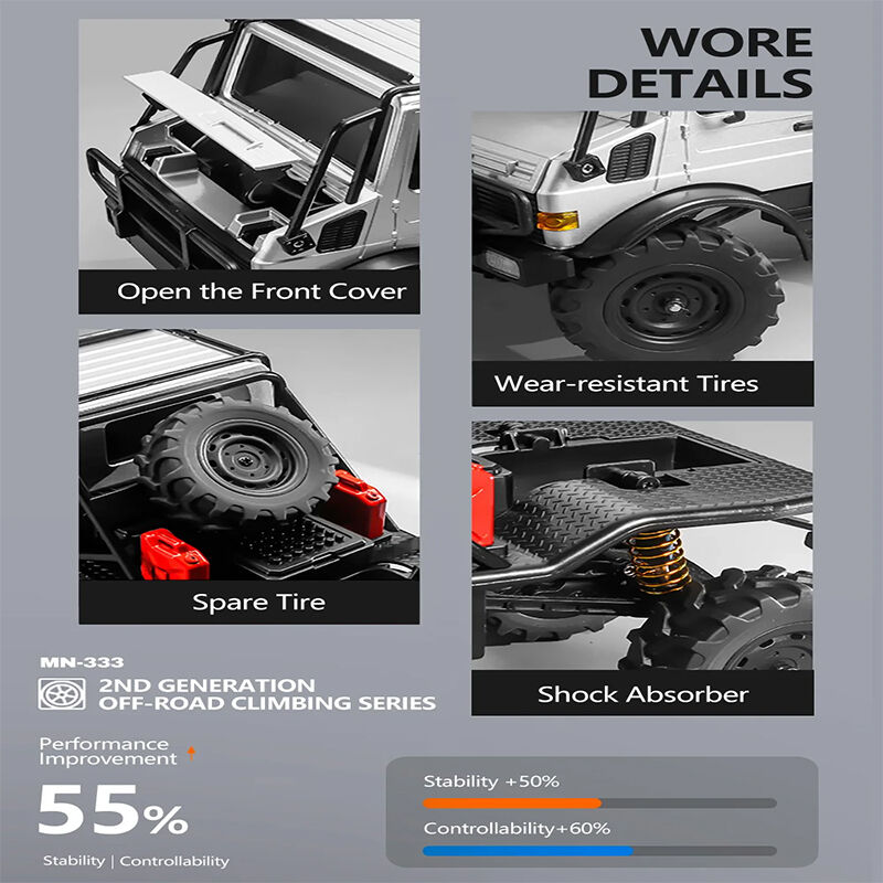 The MN MODEL MN333 RC crawler is designed to tackle rocks, dirt, and uneven terrain with ease. Its 4WD system combined with strong torque output allows it to climb and crawl over obstacles smoothly. The proportional control system ensures precise steering and throttle response, making it suitable for both beginners and experienced users. Built with a tough alloy shell and detailed finish, it offers both durability and scale realism.