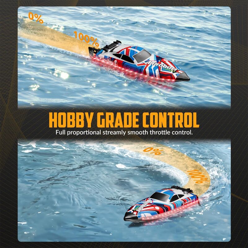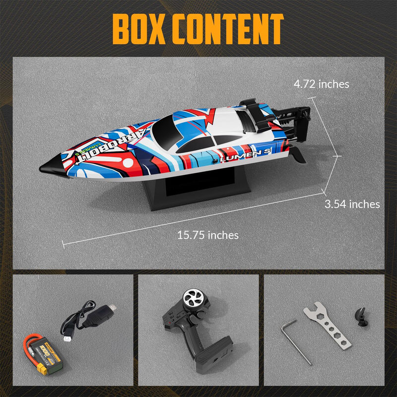 HIGH SPEED RC BOATS WITH BRUSHLESS MOTOR】The Arrobolt Lumen S is propelled by a powerful water-cooled brushless motor, designed for enthusiasts seeking exhilarating speeds up to 35+MPH. This motor, coupled with an innovative low-resistance hull, ensures stable and swift racing. The full-throttle control allows for precise speed adjustments, providing a responsive and engaging experience that hobbyists crave.