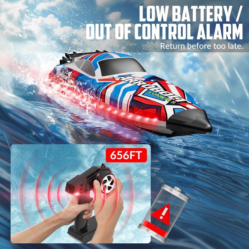 【DURABILITY AND LONGEVITY】 Our racing boat is constructed with high-quality materials, including an upgraded anti-collision silicone head for enhanced durability. Built to withstand harsh conditions and the rigors of extreme racing, it ensures long-lasting performance. A low battery and weak signal alarm system keeps you informed, ensuring a pleasant and uninterrupted water journey.