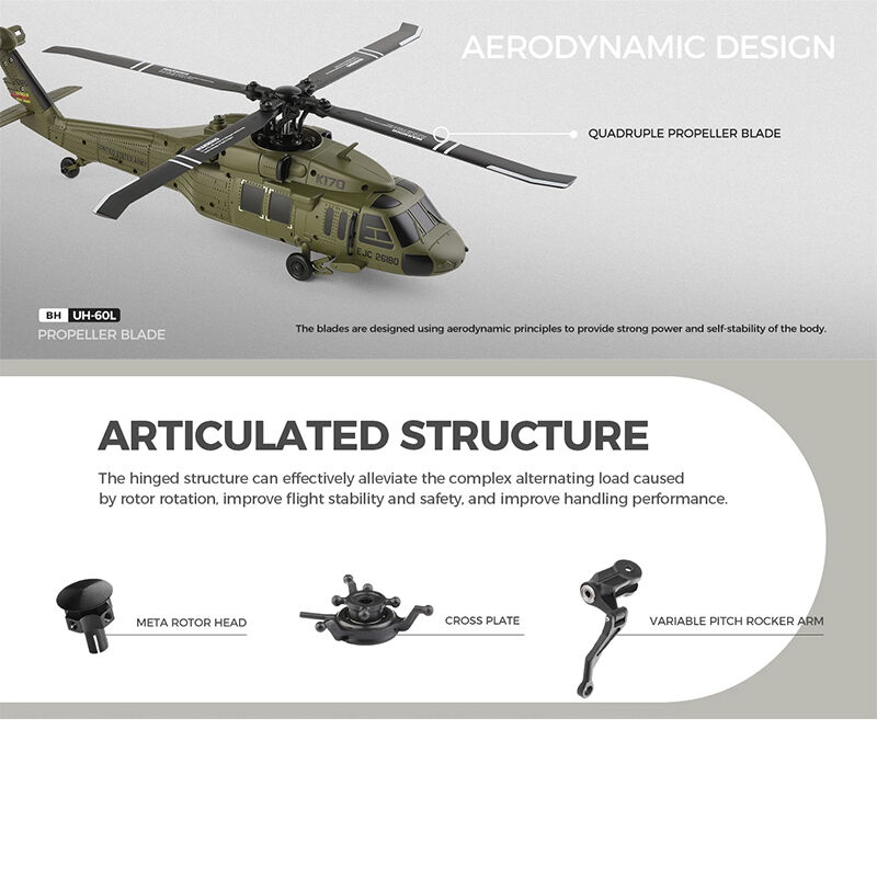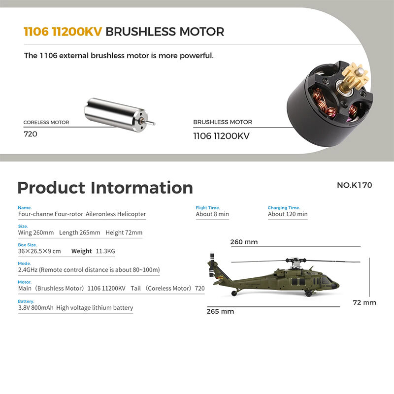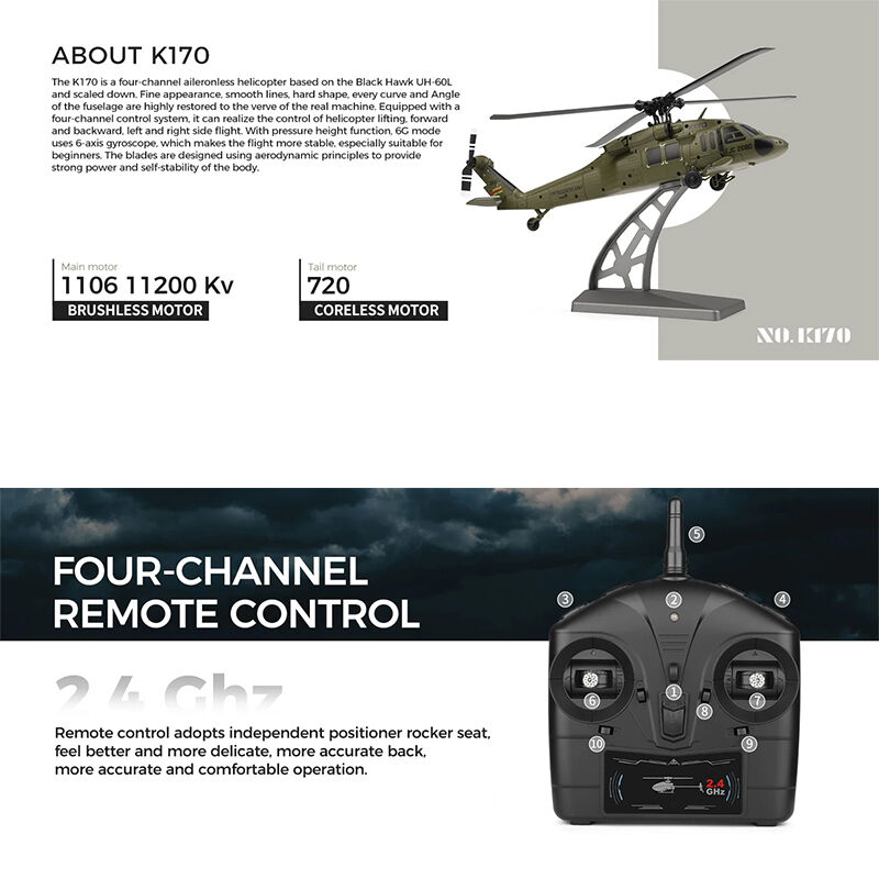 The WLtoys K170 is a detailed UH-60L Black Hawk style RC helicopter designed for stable and smooth flight. Featuring a brushless main motor and built-in gyro, it offers reliable control for both beginners and hobby users.