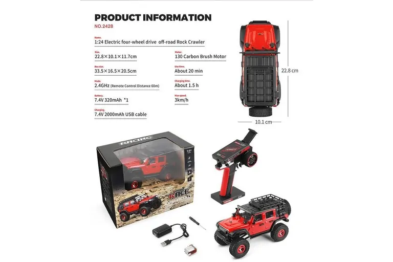 Equipped with 7.4V/320mAh rechargeable lithium battery. You can enjoy the fun of driving for about 20-30 mins